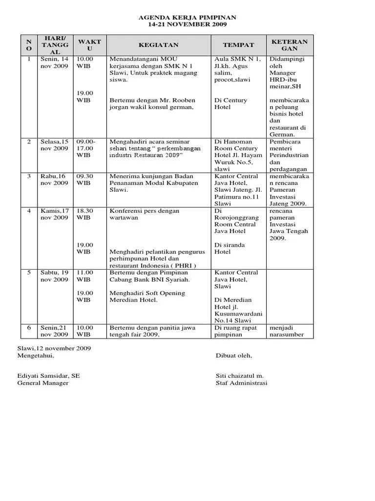 Download files in this dataset. In these page, we also have variety of images available. Malioboro yogyakarta 3 tanggal 2 oktober 2015 hari jumat melakukan pertemuan bisnis dengan dewan komisaris di bandung dengan agenda evaluasi target pemasaran dengan waktu pelaksanaan. Active desktop calender adalah sebuah aplikasi yang berfungsi sebagai pengingat kita dalam menentukan agenda kerja yang kelak ingin kita kerjakan di dalam pc/dekstop. Atas perhatian dan kesediaan ibu, kami ucapkan terima kasih. Ketik dengan menggunakan aplikasi ms word / ms excel. Buatlah agenda perjalanan dinas pimpinan berdasarkan informasi yang tersedia ke dalam format sebagai berikut: Ketua bidang pendidikan dan tenaga kerja pimpinan pusat gp ansor : Jadi, tentu saja, para pemimpin akan membutuhkan bantuan seseorang untuk meluncurkan tugas tersebut. Tugas kerja tersebut bisa berupa study banding audit ke perusahaan cabang rapat kerja nasional maupun pekerjaan pekerjaan lain yang dilakukan di luar kota tidak di lingkungan kantor sendiri. Posted in contoh contoh by aceclover contoh contoh advertisements 1. Soal perjalanan dinas pimpinan pada saat anda memasuki ruang kerja, anda mendapatkan setumpuk surat/catatan sebagai bahan untuk mengatur agenda kerja pimpinan anda. Ketik dengan menggunakan aplikasi ms.